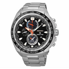 Stainless steel case with a stainless-steel bracelet. Fixed stainless steel bezel with a black top ring showing tachymeter markings. Black dial with luminous silver-tone hands and index hour markers. Minute markers. date scale around the outer rim. Dial Type: Analog. Luminescent hands and markers. Chronograph - two sub-dials displaying: 60 second and 60 minute / 12 hour (alarm). Day of the week and power reserve sub-dial below the 12 o'clock position. Seiko caliber V198 quartz movement. Scratch resistant sapphire crystal. Screw down crown. Solid case back. Round case shape, case size: 45 mm, case thickness: 12 mm. Band width: 20 mm, band length: 8.5 inches. Deployment clasp with a push button release. Water resistant at 100 meters / 330 feet. Functions: date, day, hour, minute, second, chronograph, tachymeter. Casual watch style. Watch label: Japan Movement. Seiko Sporters Solar Chronograph Black Dial Men's Watch SSC357.