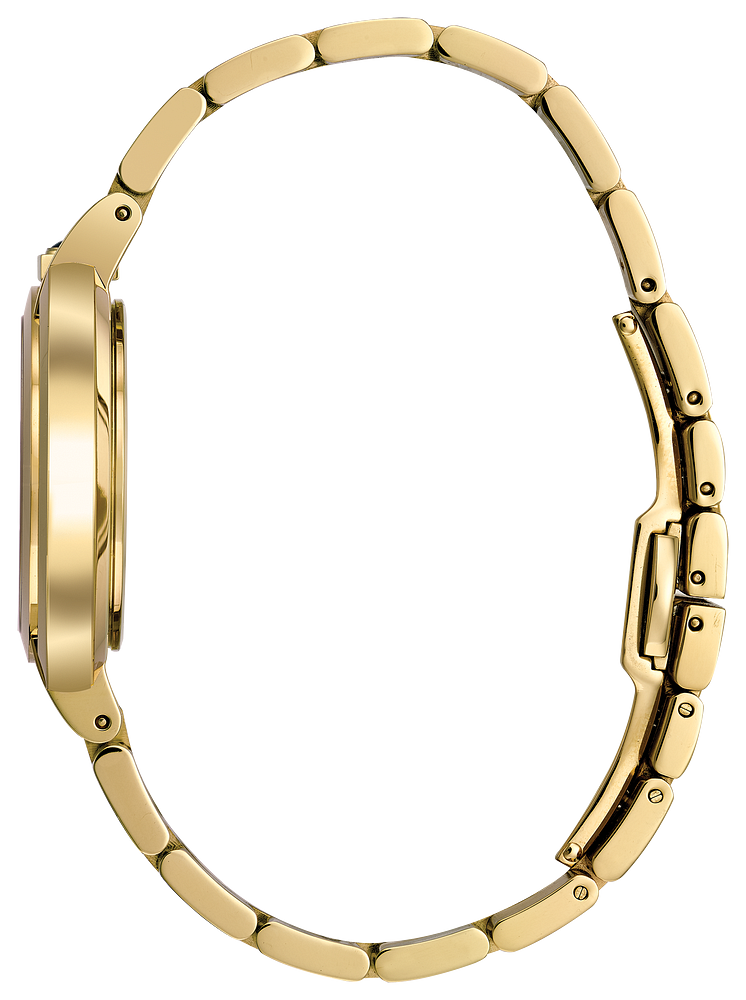 From the Rubaiyat Collection. Legendary heritage reinvented in gold-tone stainless steel case with synthetic blue spinel cabochon crown at 12 o'clock position and eight diamonds individually hand set on textured silver-white dial, double curved sapphire crystal, gold-tone stainless steel bracelet with double-press deployment closure, iconic dye struck "Goddess of Time" dimensional case back, and water resistance to 30 meters.