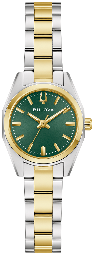 Defined by exceptional quality and sophisticated aesthetics, the Bulova ladies’ Surveyor is the quintessential contemporary timepiece. Beveled edges and faceting distinguish the petite polished silver and gold-tone stainless steel case, a flat sapphire crystal, and a matching 3-link two-tone stainless-steel bracelet with a push-button deployant clasp. Standing out as a perfect complement, the green sunray dial has gold-tone accents and hands with luminescent fill. For those with a discerning eye for refined luxury, this Bulova women’s timepiece is the perfect everyday companion.